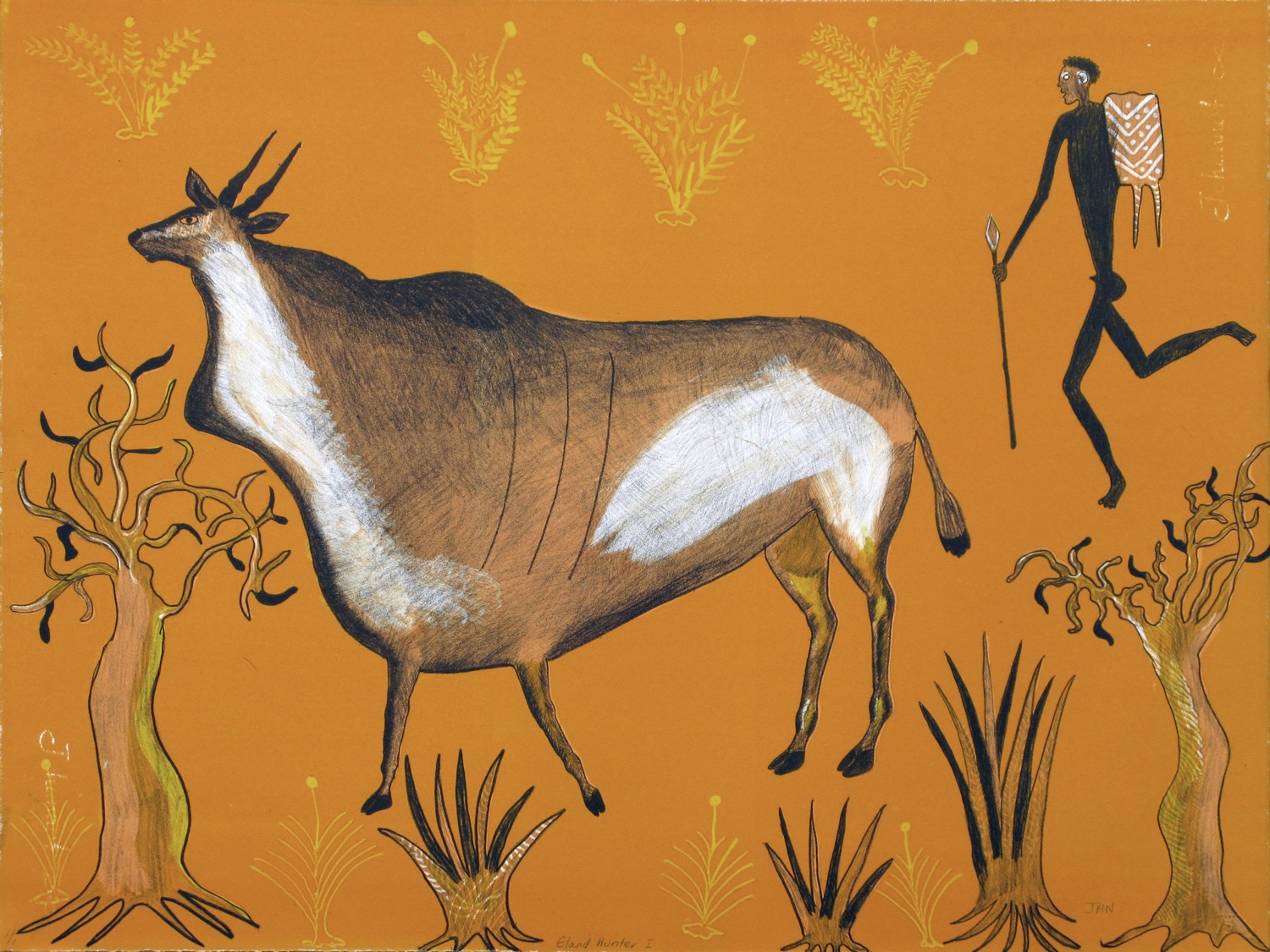 Jan Tcega joined the Kuru Art Project in January 2005. Before that, he worked as a mechanic in D’Kar (Botswana) and also made wooden carvings and wire figures which he sold to craft buyers.