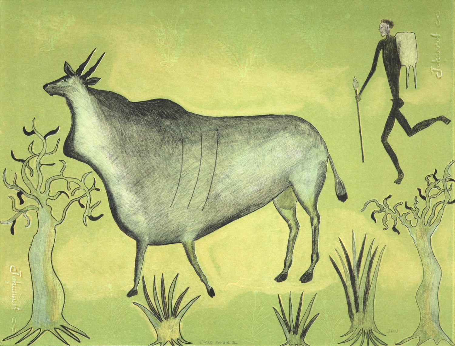 Jan Tcega is a dedicated artist and specifically enjoys printmaking. The meditative quality and process side of printmaking absorbs him. He gets almost all his inspiration from nature. Tcega has a very precise way of depicting the many animals that he knows so well. Apart from the wild animals of the Kalahari, he also likes to depict domestic animals such as dogs and goats of which there are many in the small village of D’Kar.