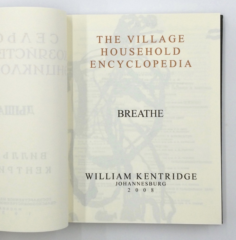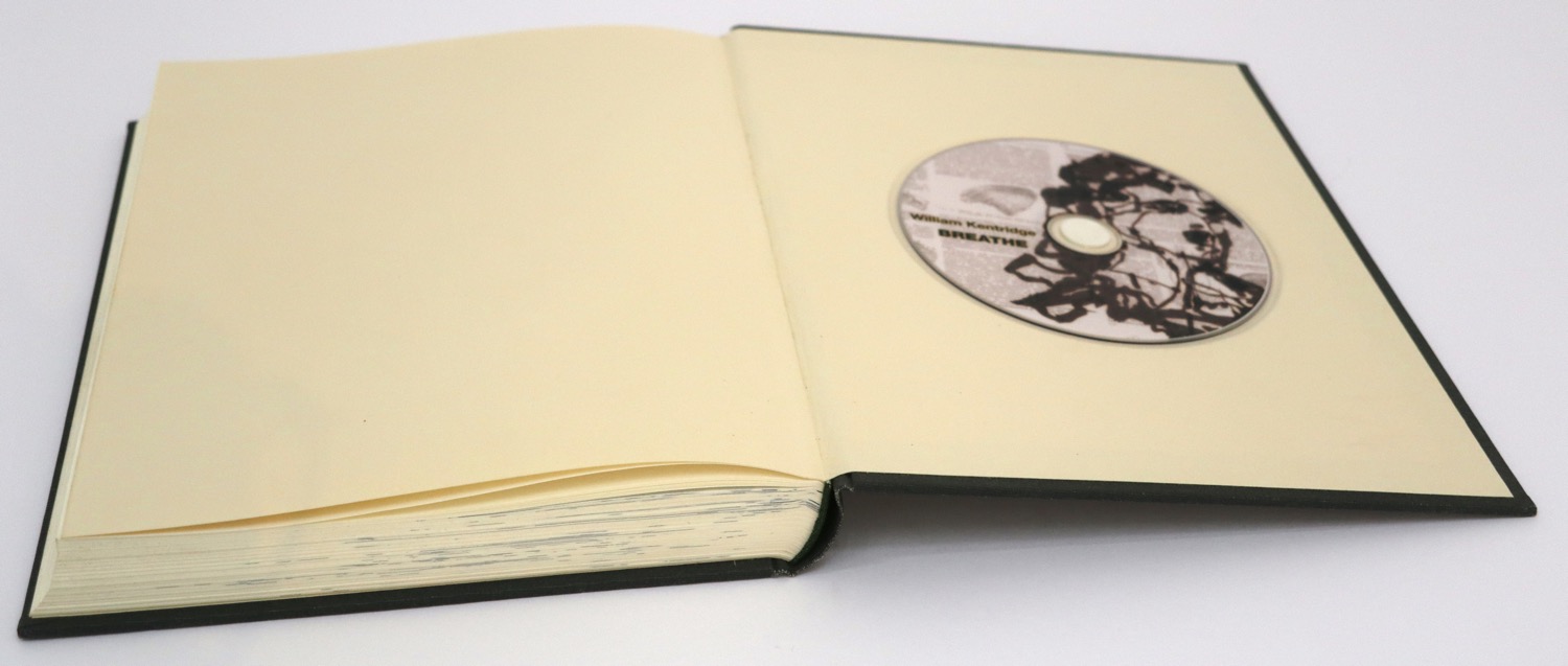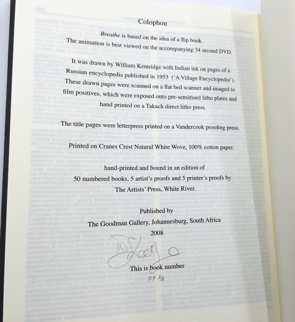 Breathe is based on the idea of a flip book, the animation is best viewed on the 34 second DVD which accompanies the book. The flip book shows a woman in a long dress who dances and slowly pirouettes. It was drawn by William Kentridge with India Ink on pages of a Russian Encyclopedia published in 1953. These drawings were scanned and imaged to positives which were then exposed onto aluminium plates. They were hand printed in 2008 in an edition of fifty numbered books plus proofs. The books were sewn and bound by the team at The Artists' Press. This book was not published by us and this is not available from us.
