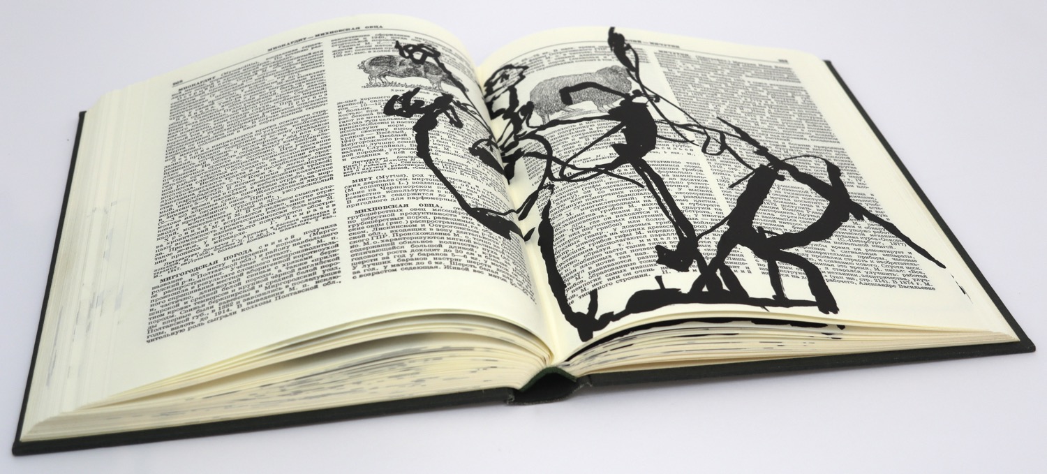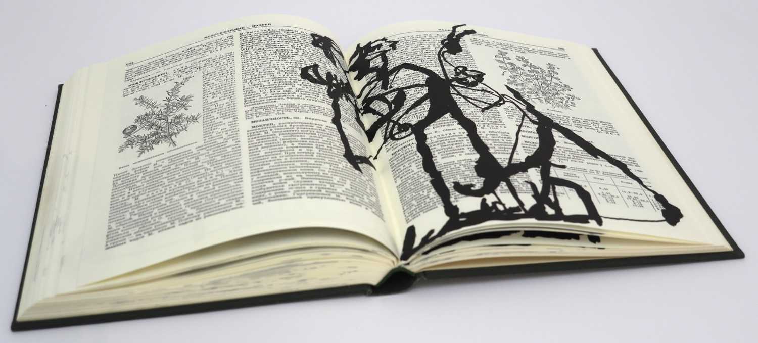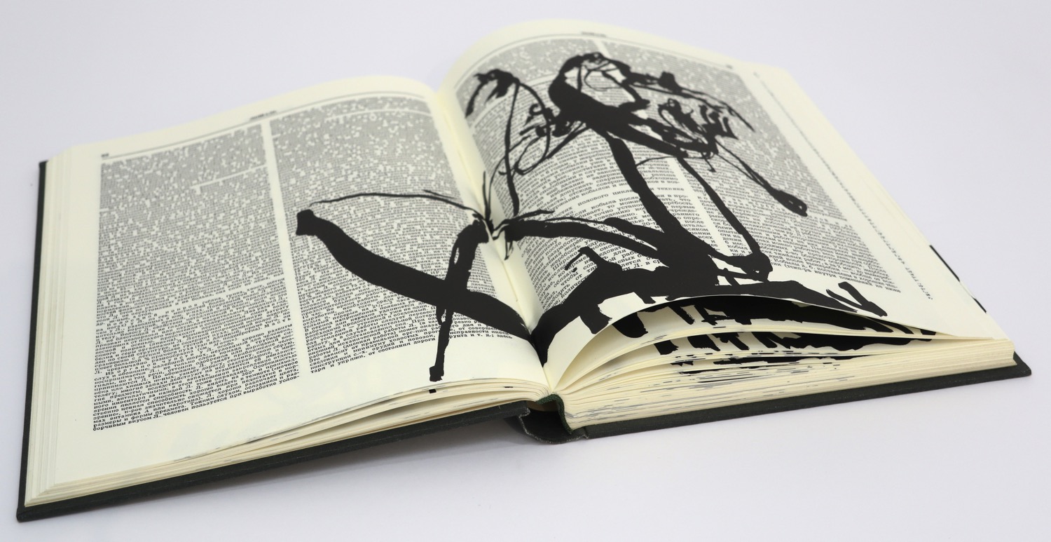 Breathe is based on the idea of a flip book, the animation is best viewed on the 34 second DVD which accompanies the book. The flip book shows a woman in a long dress who dances and slowly pirouettes. It was drawn by William Kentridge with India Ink on pages of a Russian Encyclopedia published in 1953. These drawings were scanned and imaged to positives which were then exposed onto aluminium plates. They were hand printed in 2008 in an edition of fifty numbered books plus proofs. The books were sewn and bound by the team at The Artists' Press. This book was not published by us and this is not available from us.