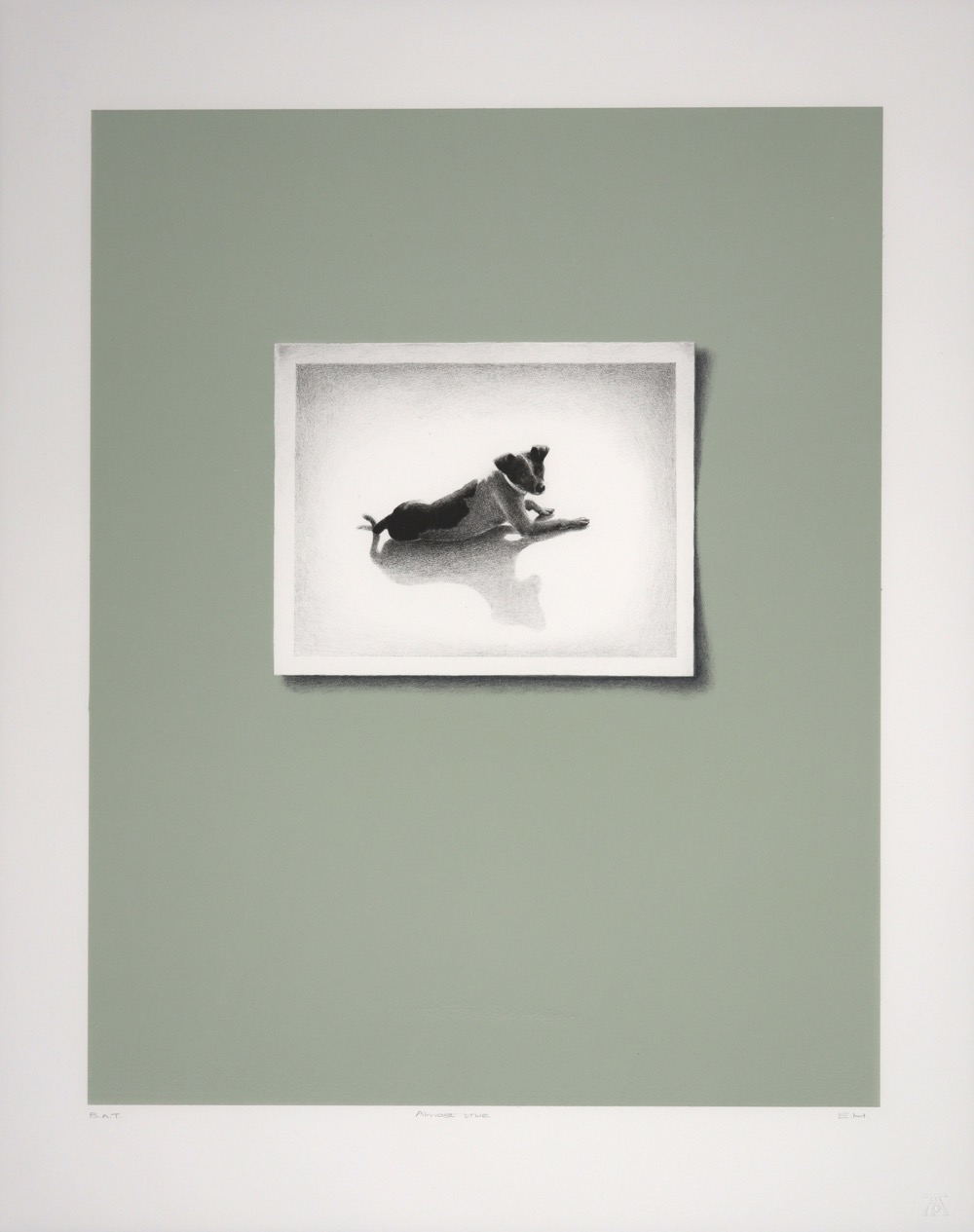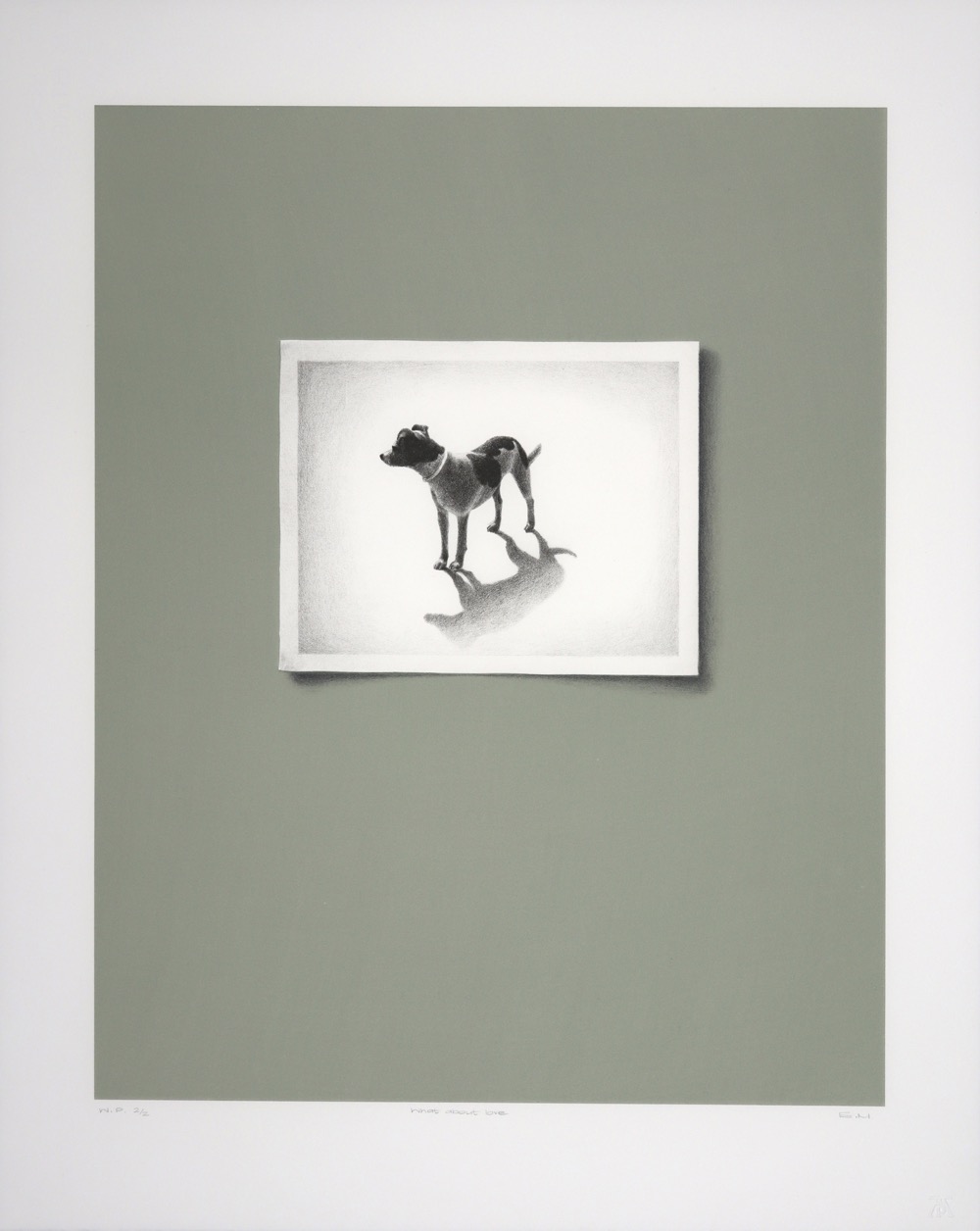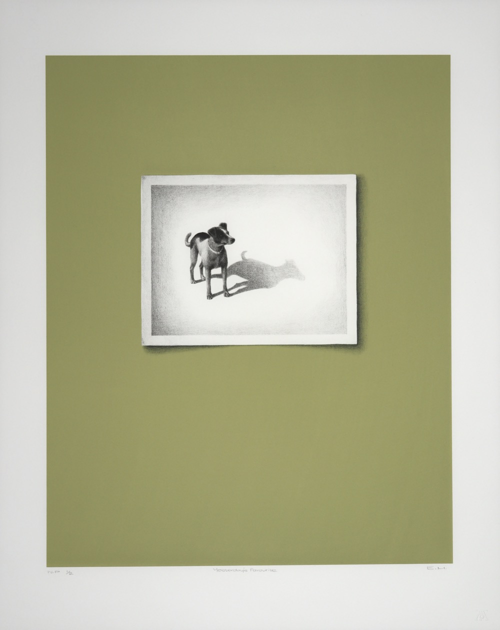 In the "Lost and Found" series created in 2011, Marais explores the versatile medium of lithography, skillfully interweaving drawing techniques. Against flat, backgrounds that convey a sense of spatial detachment, she employs canine portraits to evoke emotions like love and yearning. The undercurrent of nostalgia is accentuated by the meticulous rendering of black and white photographic references.