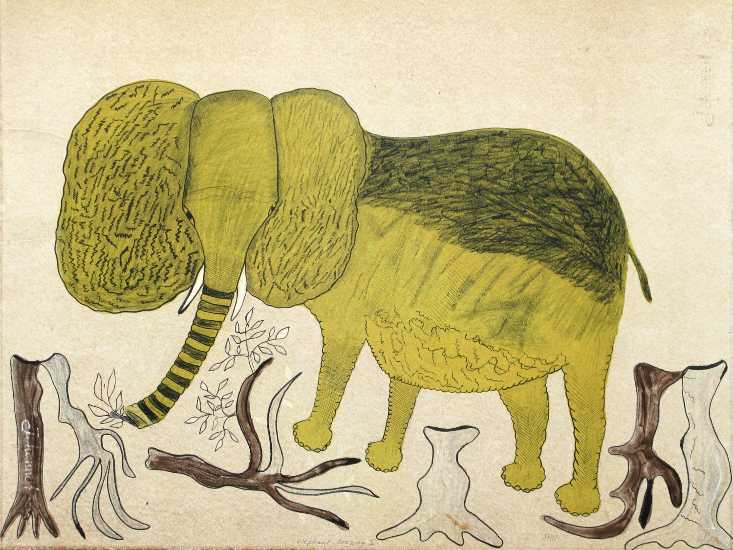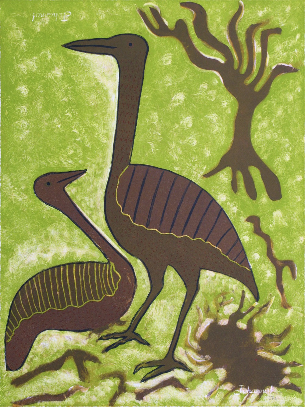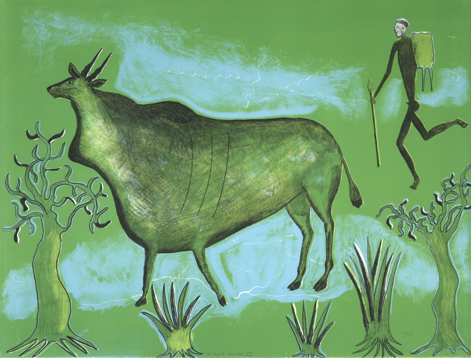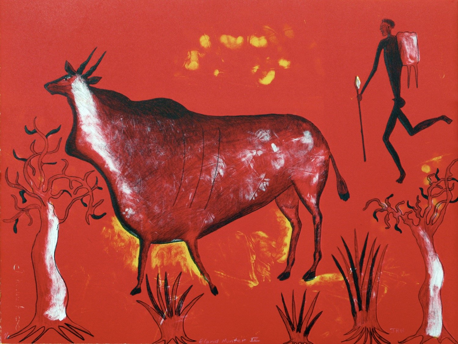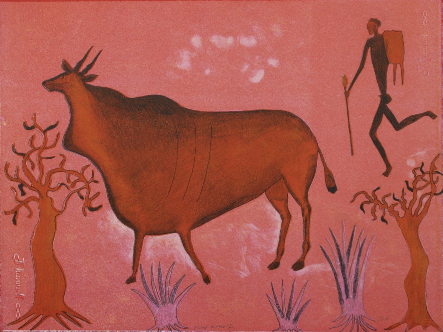Jan Tcega is a dedicated artist and specifically enjoys printmaking. The meditative quality and process side of printmaking absorbs him. He gets almost all his inspiration from nature. Tcega has a very precise way of depicting the many animals that he knows so well. Apart from the wild animals of the Kalahari, he also likes to depict domestic animals such as dogs and goats of which there are many in the small village of D’Kar.