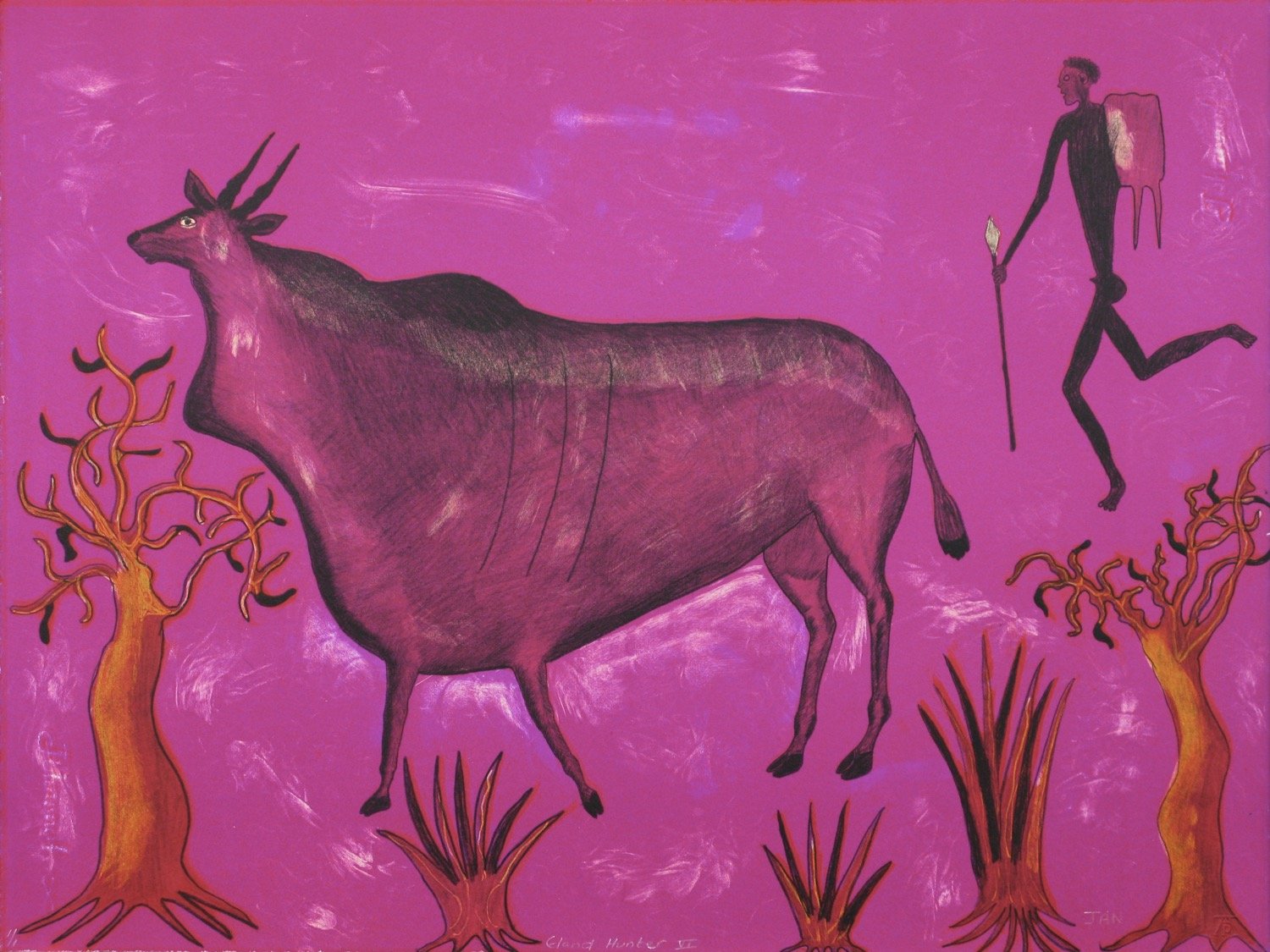 Jan Tcega joined the Kuru Art Project in January 2005. Before that, he worked as a mechanic in D’Kar (Botswana) and also made wooden carvings and wire figures which he sold to craft buyers.