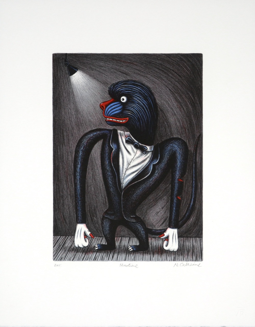Catherine's lithographs are beautiful examples of his fine drawing skills with a perfectionists understanding of colour. The titles play with words and the images draw on humour, fear, social and personal politics and a brush of the absurd.