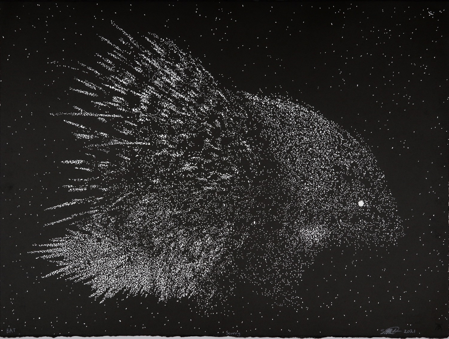 "Scurry is an extension of my previous linocuts, Spotted and Constellation. As part of my degree, I have been studying rock paintings in Mpumalanga. During the pandemic, I visited a rock art site with my mother. Upon entering the shelter she asked me if we would run into any porcupines and I reassured her we would not, considering that I have never seen them on foot. Moments later a mother porcupine and its offspring came scurrying out from a tunnel under the rock. Fortunately, they ducked back into another burrow instead of picking a fight with us. This linocut is a meditation on that experience. There is so much we think we know, but often what we think will happen is not very accurate. The porcupine embodies this. With putting camera traps up on our property some unexpected visitors included a pair of porcupines. The image that this linocut is based on was taken with a camera trap in the reedbed of a river near where I live."