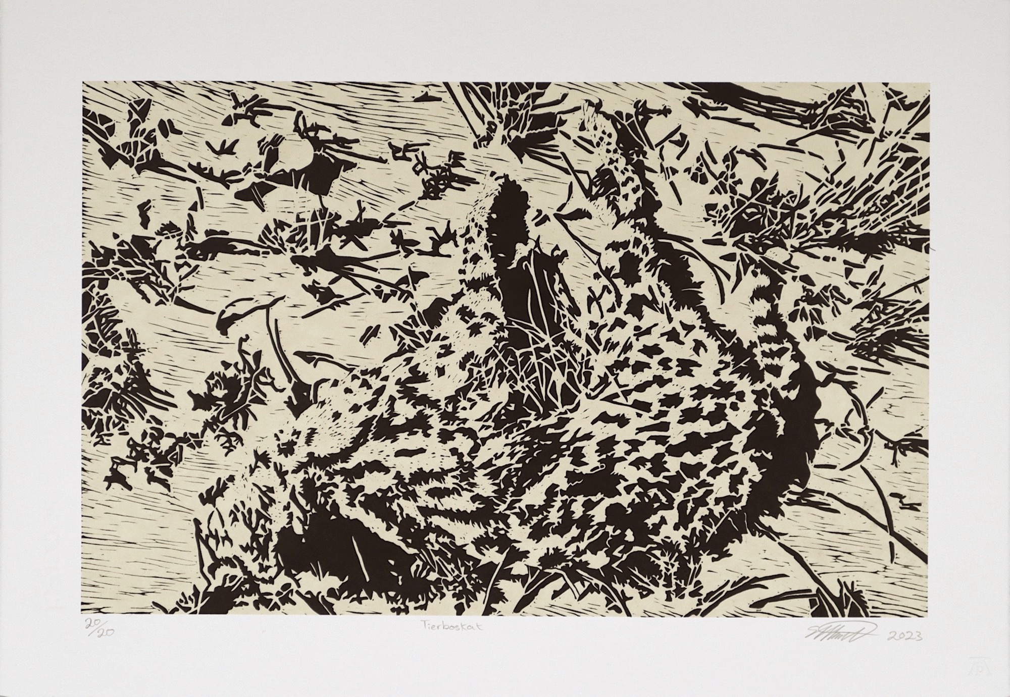 "Tierboskat and Naguiltjie are linocuts of the shadows of a roadkill serval and nightjar melting into the ground. The twilight call of a nightjar always brings me back to the granite hills of the Mpumalanga Lowveld. Naguiltjies are generally quite shy and keep away from people. The print is a tribute to this often-heard but rarely-seen, elaborately plumaged bird. Seeing them up close is remarkable. They look like strange tiny owls with the body of a hawk. Nightjars are particularly susceptible to being hit by cars as they often sit on the road at night and are slow to fly off." Simon Attwood, 2023
