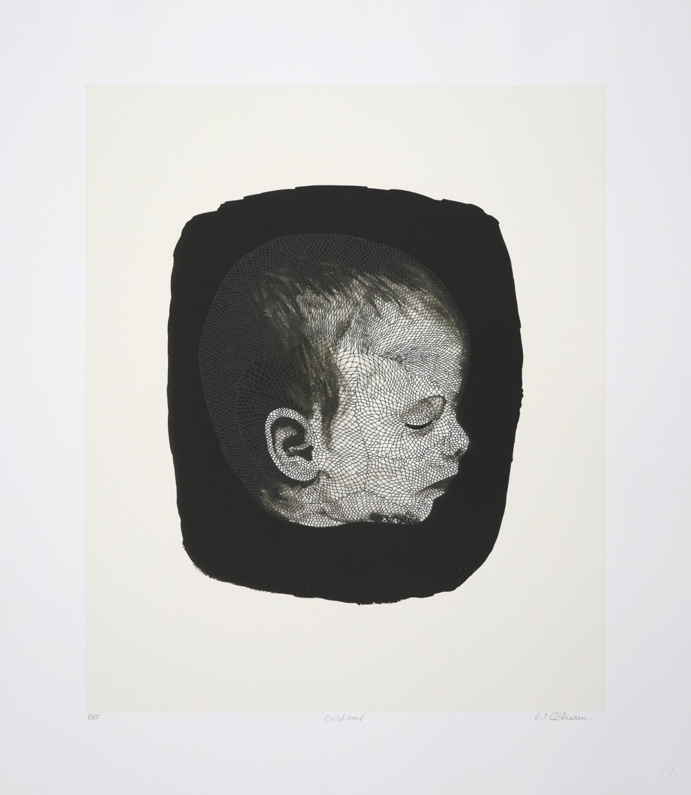 In the four letterpress prints Oltmann depicts three child skulls and an image of a baby. The lacelike quality of the images recalls domestic doily and knitted craft work. The fragility of babies and small children is affectionately captured by Walter in these beautiful prints.