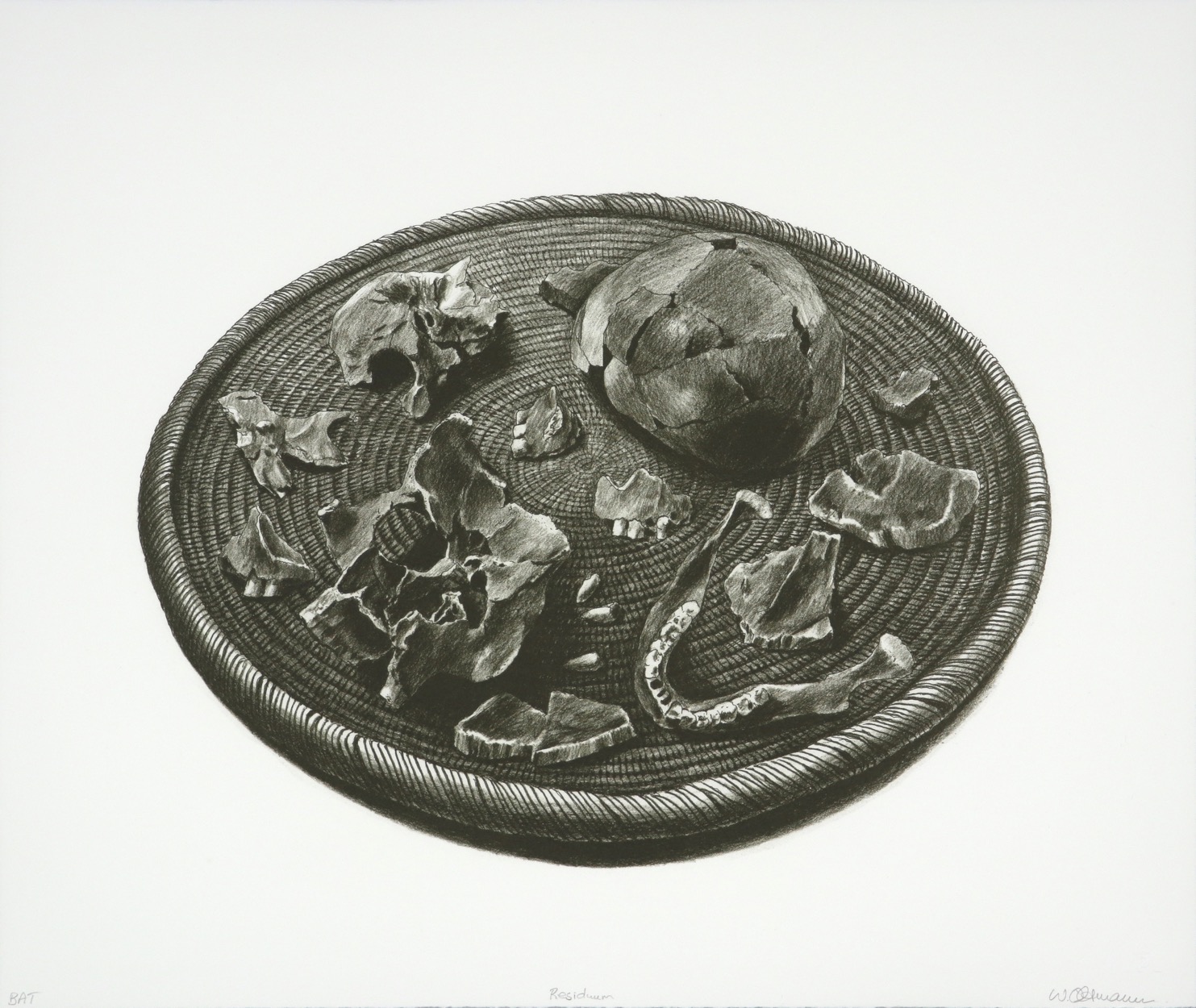 In his Cradle prints Walter Oltmann focuses on a series of human skulls, notably those of children and young adults, (photographed from the Raymond Dart Collection of human skeletons, School of Anatomical Sciences, Wits University) and selected photographic images of South African landscapes taken at rock engraving sites. The wide-open, rocky landscapes evoke a harsh geography and in relation to the images of the skulls they carry a sense of absence and immutability.