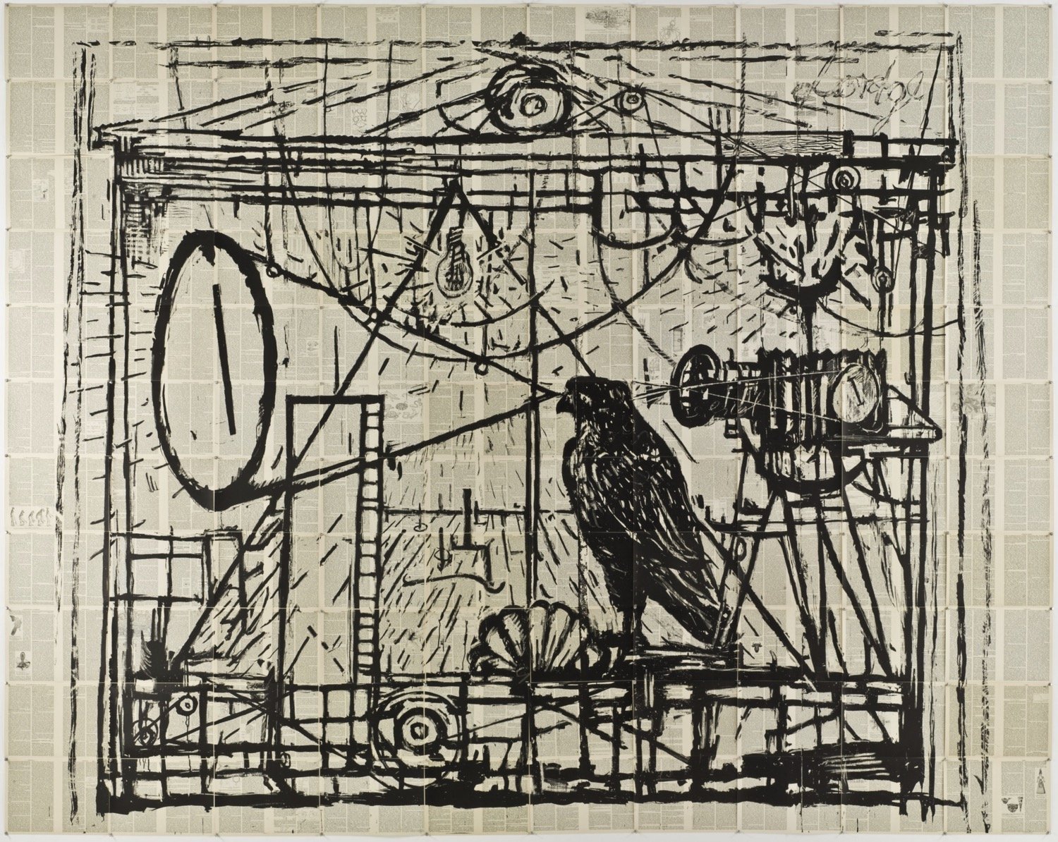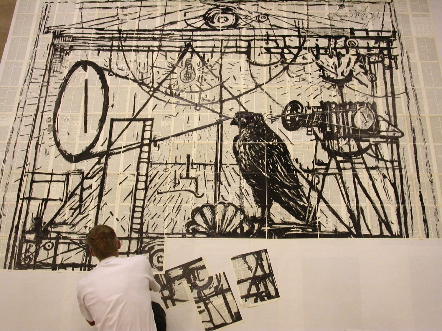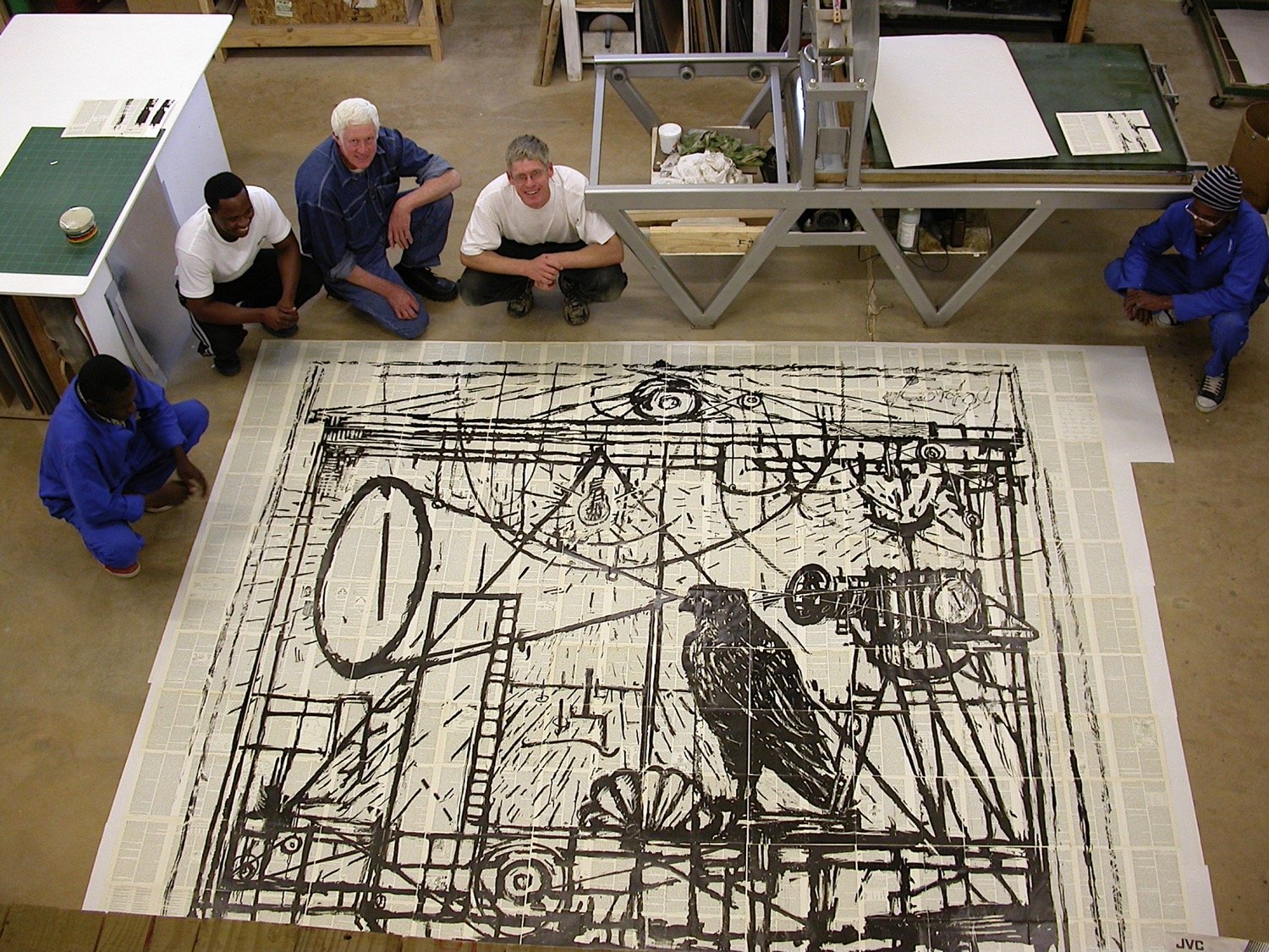 Learning the Flute is a print which consists of 110 panels done by William Kentridge in 2003 in collaboration with The Artists' Press and published by The Goodman Gallery. It was in two editions consisting of eighteen numbered prints with additional proofs. The one edition was black on white and the other reversed so that the negative was printed black. The final size of the work is 283 x 358cm and was presented in a box handmade by Peter Carstens.