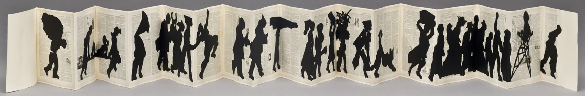 Portage is a fold out book (Leporello) by William Kentridge that he did with The Artists' Press in 2000. The images were hand torn and chine colléd onto cream Arches paper. Portage is limited to an edition of 33 books.