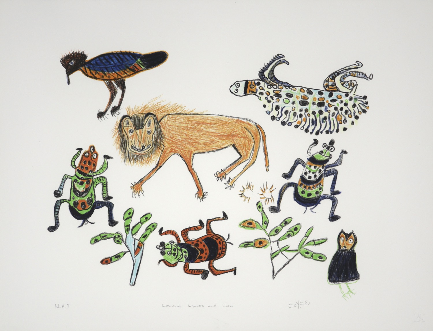 Unlike the other women artists at the Kuru Art Project, Bob also likes to depict animals, especially those found in the Kalahari. She passionately loves the Kalahari veld with all its creatures. Thus creatures like wild dogs, with their red tongues and spotted bodies, owls and insects like praying mantises appear in her work. For her, the creative process is more important than the final product. In this way, a bird can easily be transformed into a plant and vice versa.