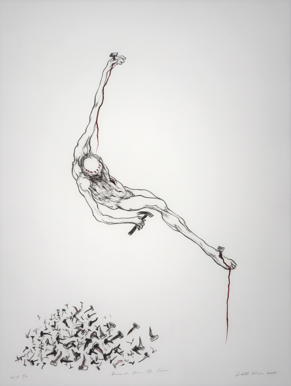 "Descent from the Cross is one of my favourite subjects and I have painted several versions. This lithograph is a variant on the image I used in the Purgatorio panel of "Walking with and away from Dante". The panel describes Purgatory as a temporal condition, and is an attempt to mend the wrongs wrought by us. A self-sufficient victim of crucifixion is an element in its rather complicated visual argument." Judith Mason, 2008.