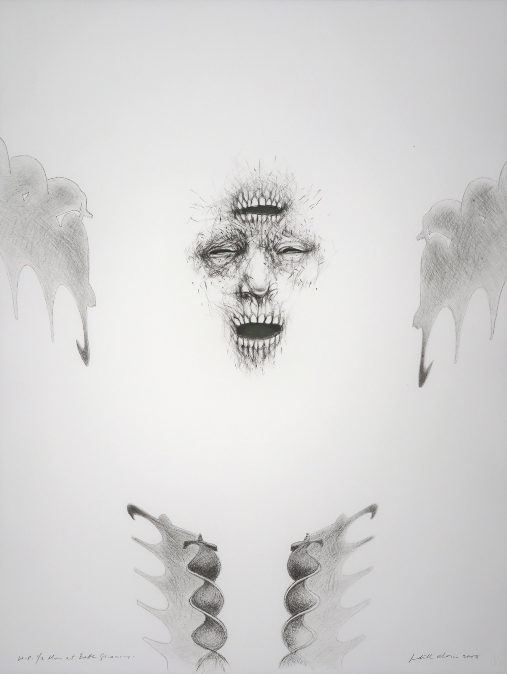 "Man at Battle Grinning gets its title from a line in Patrick Cullinan's poem, "For Rebecca, born at Midwinter", and also refers to the suicide bomber depicted in one of the Inferno panels in "Walking with and away from Dante". The mouth is reprised as an open shout on the forehead - a wound, and a war-cry. I used drawings of augers to create a sense of weaponry and armour." Judith Mason, 2008.
