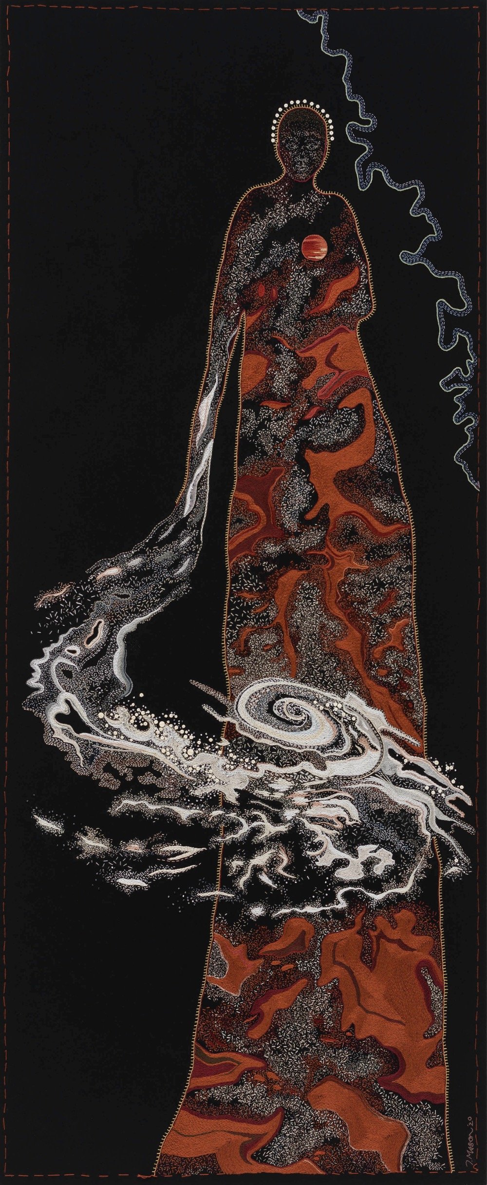 Large works on fabric are the focus of Mason’s work. With hand-embroidered compositions on black suiting material, Mason integrates personal narratives into wider themes of environmental crisis, motherhood and history. Her artwork reflects the complexities of everyday life and landscapes in rural Southern Africa.